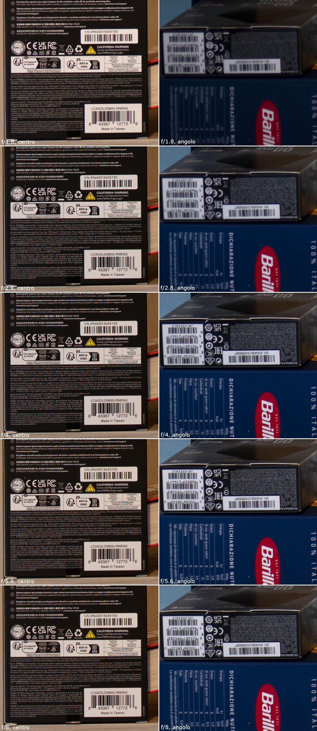 Vediamo come sempre i ritagli al 100% dal file RAW, osservando angolo e centro ai principali diaframmi.
