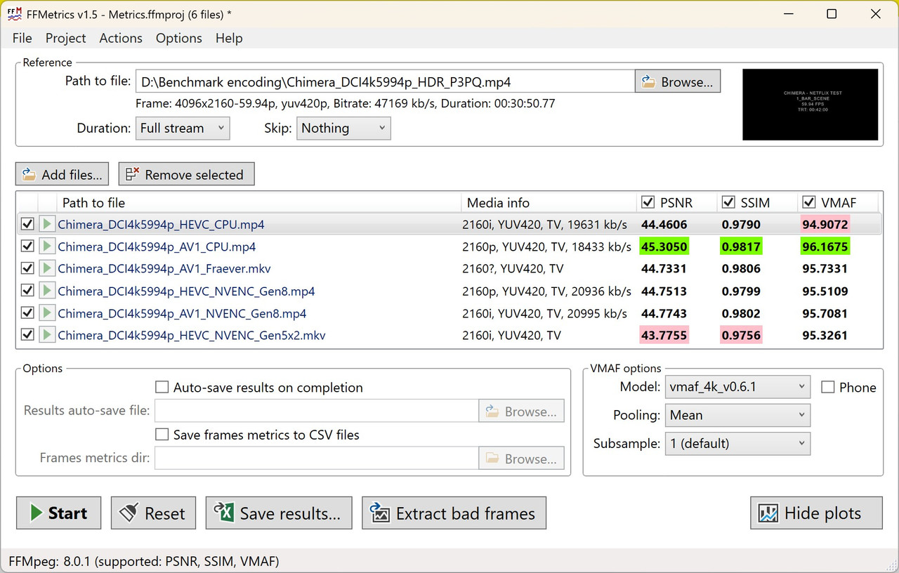 Ipotizzo che questa discrepanza sia dovuta al fatto che ha utilizzato la codifica constant quality, che probabilmente ha sfruttato un bitrate superiore in quella scena, a scapito delle altre. Ho anche calcolato le metriche SSIMULACRA2, Butteraugli e CVVDP per la codifica AV1 software. “ SSIMULACRA2 Score Interpretation 90+ (Very High Quality): Visually lossless or nearly so, difficult to distinguish from the original. 70-90 (High Quality): Good quality with minimal, slightly annoying artifacts. 50-70 (Medium Quality): Noticeable but not overly distracting artifacts; a common range for quality/size tradeoffs. Below 50 (Low Quality): Obvious and annoying distortions, like blockiness or banding. Negative Scores: Extremely low quality, very strong distortion. „ SSIMU2 Result between .\Chimera_DCI4k5994p_HDR_P3PQ.mp4 and .\Chimera_DCI4k5994p_AV1_CPU.mp4 Computed 110935 frames at 60 fps -----------SSIMULACRA2----------- Average : 69.001573 Standard Deviation : 16.058778 Median : 70.378708 5th percentile : 37.675846 95th percentile : 97.125359 Minimum : -28.823952 Maximum : 99.907600 “ A Butteraugli score measures the perceived difference between two images, with lower scores being better, indicating less noticeable artifacts, Score Interpretation Guidelines 0.0: Images are identical. < 1.0: Imperceptible difference; excellent quality. 1.0: Considered a good/normal quality level. 1.0 - 1.6: Works as designed; a great value for compression. 1.6 - 2.1: Okayish; difference might be noticeable but not severe. 2.1+: Noticeable artifacts likely appear, especially in a flip test. 2.5+: Significant visible issues, beyond typical practical relevance. „ Butteraugli Result between .\Chimera_DCI4k5994p_HDR_P3PQ.mp4 and .\Chimera_DCI4k5994p_AV1_CPU.mp4 Computed 110935 frames at 26 fps -------------2-Norm-------------- Average : 1.166669 Standard Deviation : 0.602001 Median : 1.207241 5th percentile : 0.018664 95th percentile : 2.197356 Minimum : 0.001238 Maximum : 5.134084 -------------3-Norm-------------- Average : 1.268339 Standard Deviation : 0.627278 Median : 1.290373 5th percentile : 0.041309 95th percentile : 2.360456 Minimum : 0.001440 Maximum : 5.594105 ------------INF-Norm------------- Average : 7.022492 Standard Deviation : 3.932461 Median : 6.423678 5th percentile : 0.723633 95th percentile : 13.641651 Minimum : 0.017417 Maximum : 39.526646 CVVDP Result between .\Chimera_DCI4k5994p_HDR_P3PQ.mp4 and .\Chimera_DCI4k5994p_AV1_CPU.mp4 Computed 110935 frames at 36 fps ----------------CVVDP--------------- Video Score: 9.7401 Risultato encoding di Fraever SSIMULACRA AVG 66.0628 BUTTERAUGLI inf-norm 9.3517 CVVDP 9.728 Un primo comparison dove si può apprezzare come i diversi encoder gestiscono la grana slow.pics/c/A8O8922L |