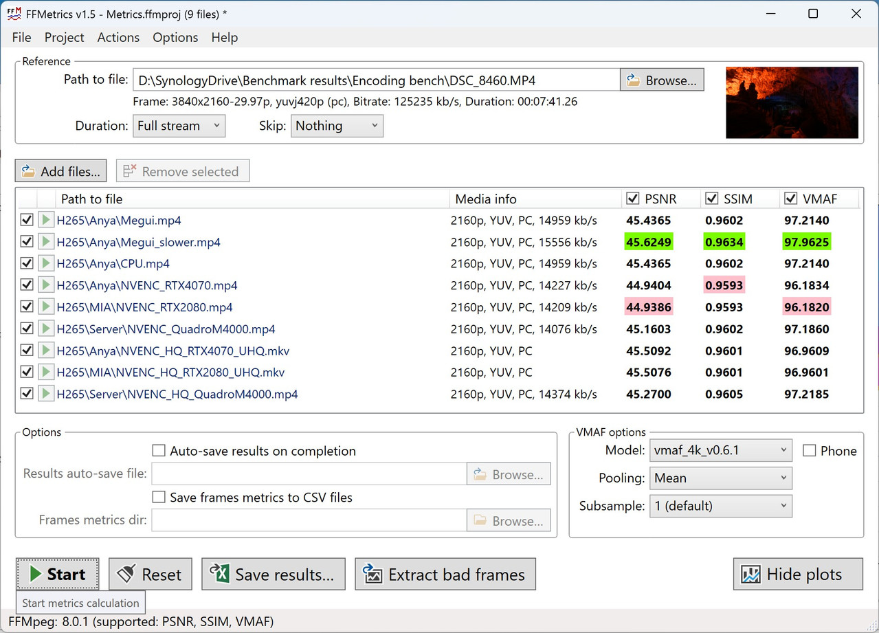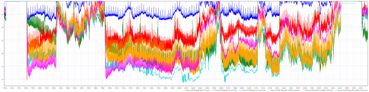 Qui le metriche con RTX 5070 Ti (due encoder di generazione 9) [IMG]https://postimg.cc/ph481fG3[/IMG] AV1 risulta migliore in queste misure, vedremo se si confermerà anche negli screenshot. Da notare che nella scena del bambino fra le fontanelle, piuttosto impegnativo per i dettagli in movimento, la codifica di Fraever con la metrica VMAF risulta nettamente migliore (è quella in blu) La Quadro in questo caso si comporta decisamente peggio.