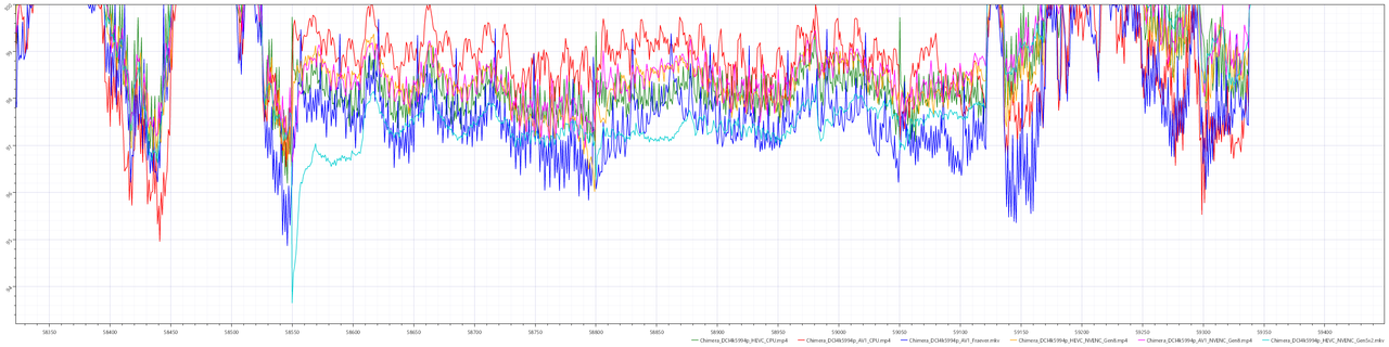@Fraever c'è qualcosa che non torna nelle metriche, ho preso 3 screen di megui e CPU, e sono uguali bit a bit Ho capito la stranezza: l'output di megui è identico a quello di shutter encoder, ma ancora lo spazio colore è diverso. Quando estraggo i frame con Ffmpeg si vede la differenza, ma poi Kmplayer utilizza lo stesso spazio e di screenshot sono identici. C'è un'altra stranezza: ho provato a demuxare i flussi video, e rifare le metriche. L'estrazione dei bad frames funziona comunque, ma sbaglia l'indice del fotogramma nel nome. *****PROVE DI CODIFICA 4K 60FPS, sorgente video di test da Nettlfix Open Source Content Con l'aiuto di Fraever, ho fatto alcune prove di codifica con il seguente video test open source di netflix download.opencontent.netflix.com.s3.amazonaws.com/Chimera/Chimera_DCI4 Ho impostato la codifica VBR a 20000Kb/s, ed utilizzato Fastflix con in modalità software oppure con Rigaya NVENC. Questa versione dell'encoder hardware permette anche di separare l'encoding in più flussi e parallelizzarli: [IMG]https://github.com/rigaya/NVEnc/blob/master/data/nvencc_parallel_encode_20250320_en.png?raw=true[/IMG] è utile in configurazioni multi-gpu oppure per quelle schede che hanno più di un encoder. Ho utilizzato la feature per la Quadro M4000 che ne ha due, di fatto dimezzando i tempi e raddoppiando i fps. Di seguito le prestazioni di codifica. Da tenere presente che x265 è limitato a 16 thread, ed anche SVT-AV1 sembra avere tale limite I test su Ryzen e RTX 5070 Ti sono stati condotti da Murphy, che ringrazio. 23.27fps CPU Core Ultra 265K H265 preset medium 19.98fps NVENC H265 RTX 4070 --preset p7 --tune uhq 25.67fps NVENC AV1 RTX 4070 --preset p7 --tune uhq 22.48fps CPU Core Ultra 265K AV1 preset 5 48.32fps NVENC H265 Quadro M4000 x2 --preset p7 (--tune uhq non disponibile) 53.1fps NVENC H265 RTX 5070 Ti x2 --preset p7 --tune uhq 65.6fps NVENCAV1 RTX 5070 Ti x2 --preset p7 --tune uhq - 2 pass encoding, solo la seconda passata Sono abbastanza allineate, tranne per la Quadro che non supporta l'uhq, disponibile solo dalle GPU Turing. Quadro M4000 e RTX5070 Ti hanno due encoder e raddoppiano le performance. Fraever ha utilizzato svt-hdr con i seguenti parametri --preset 3 --crf 40 --tune 0 --enable-tf 0 --enable-restoration 0 --enable-cdef 0 --complex-hvs 1 --tx-bias 1 --ac-bias 4.00 --tile-columns 0 --tile-rows 0 --lookahead 120 Con una conversione molto lenta, ben sotto i 10fps. Ha inoltre codificato a 10 bit Altre conversioni software, valide come benchmark di prestazioni: 10.22 fps CPU Xeon E5-2690 V4 H265 preset medium 12.95 fps CPU Xeon E5-2696 V4 x2 H265 preset medium 11fps CPU Xeon E5-2696 V4 x2 AV1 preset 5 13.35fps CPU Ryzen 5 7600x H265 preset medium Qui le metriche. Ho usato come notazione la generazione dell'encoder (8 per la RTX4070, 5 per la Quadro), in quanto non varia fra schede della stessa serie.