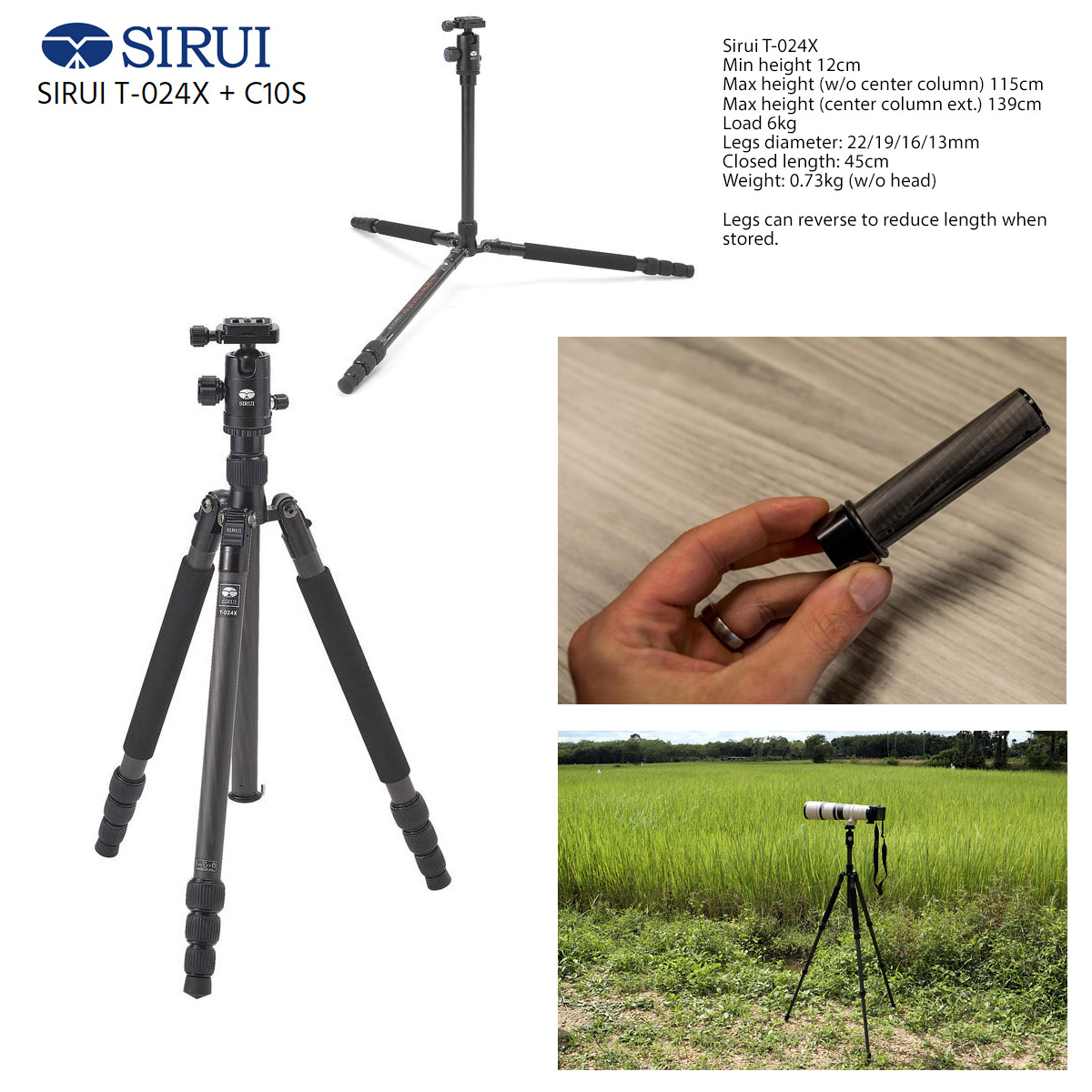 Vendo treppiede da viaggio Sirui T-024X in carbonio con testa C-10 sempre marca Sirui, con sacca morbida di trasporto, colonna corta sostituibile a quella lunga, scatola originale.